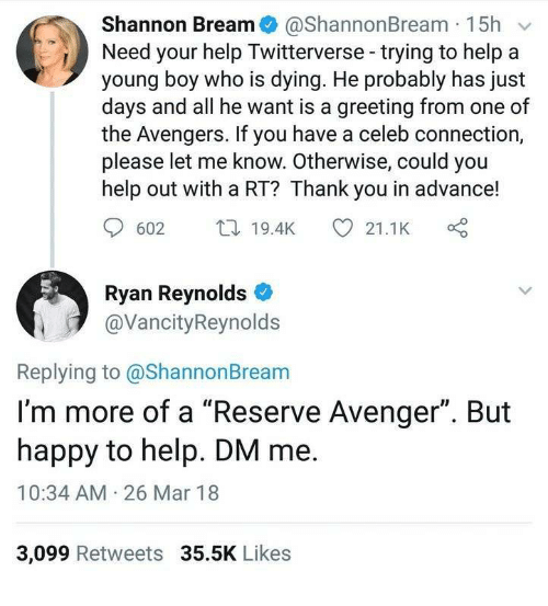 ▼或許有可能。之前美國一名電視台女主播就在推特發出請求,表示有一名重病男孩非常渴望看到漫威超級英雄。結果美國隊長和死侍都答應了安排見面。