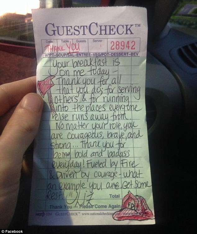 ▼Liz的父親也曾是消防員,她對打火英雄非常尊敬,就自掏腰包為他們付了帳單,還親自為他們製作餐點,並附上貼心的紙條,說:「你們的早餐我包了,感謝你們為了拯救生命而不顧一切!」