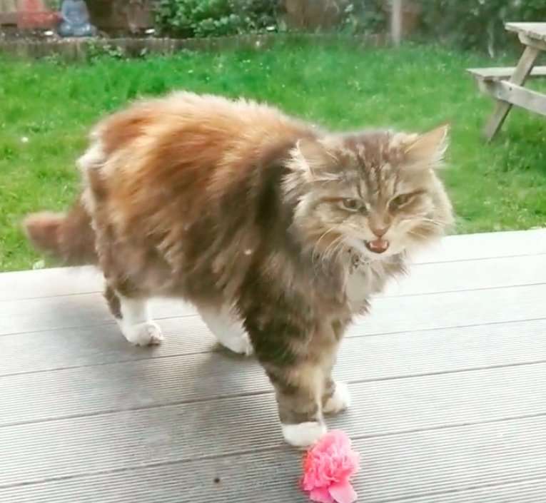 ▼Rosie很驚訝:「我知道貓咪會『報恩』,但沒聽說過牠們會送花。」Rosie一家都很驚喜,也很期待隔壁的小紳士繼續帶著花過來拜訪。