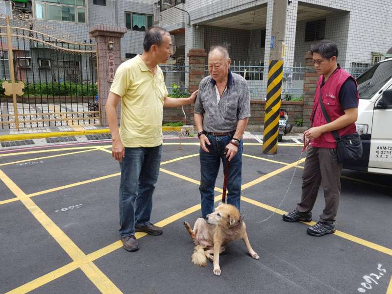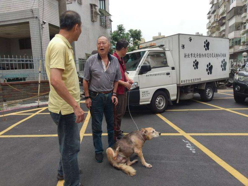 ▼已經10歲的妞妞是一隻混狼犬的大型犬,高齡的牠現在走起路來也不穩,必須求助新北市動保處。經過協商後,「照顧生命協會」決定收養妞妞,讓劉伯伯放心。
