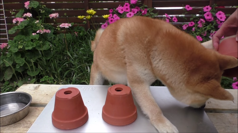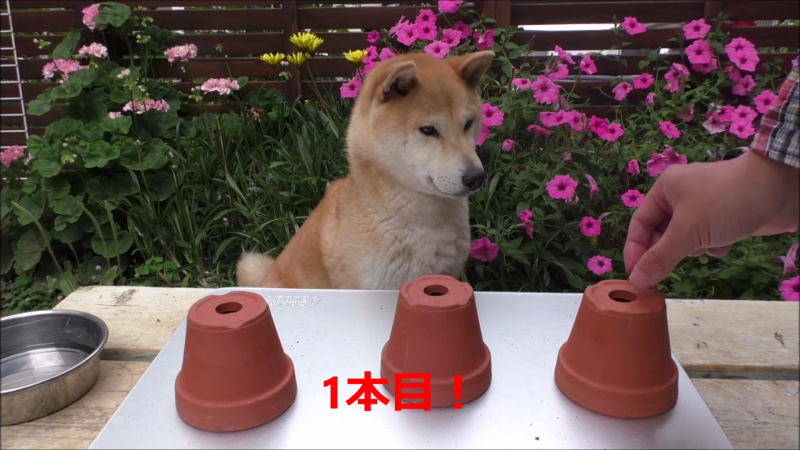 ▼主人在小春面前放了三個倒扣的花盆,在最右邊的花盆中放入狗糧,然後交換右邊和中間的兩個花盆的位置。