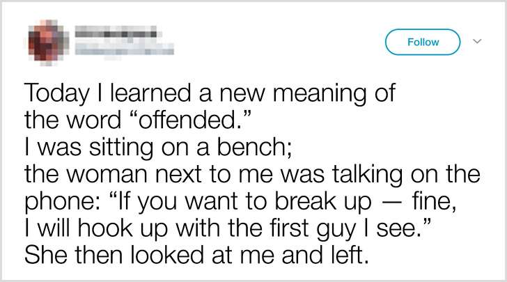 ▼「今天早上我對『冒犯』這個詞有了新的理解。我坐在凳子上,一位女士坐在旁邊講電話:『如果你想分手,好,我會立刻與看到的第一個人在一起。』然後,她看了我一眼就離開了。」