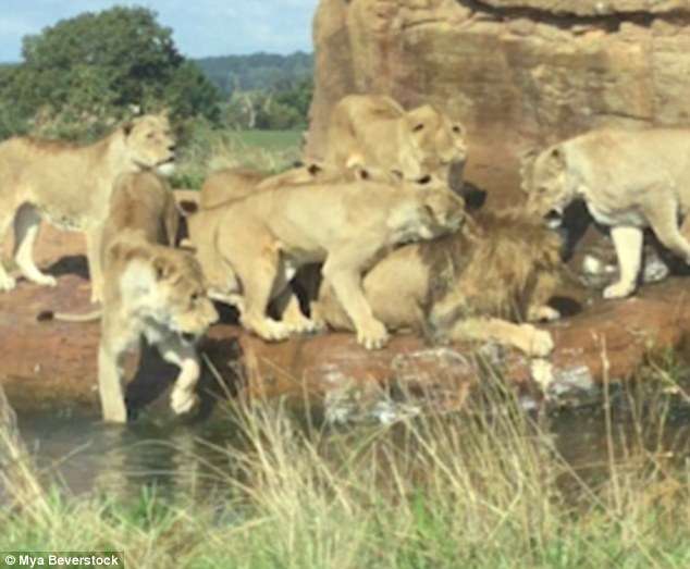 ▼面對年輕力壯的母獅,雄獅無力反抗,只能痛苦咆哮。動物園的工作人員發現後,連忙驅車趕往現場,鳴喇叭、向獅群噴射滅火器噴霧,這才阻止了母獅們的行動。
