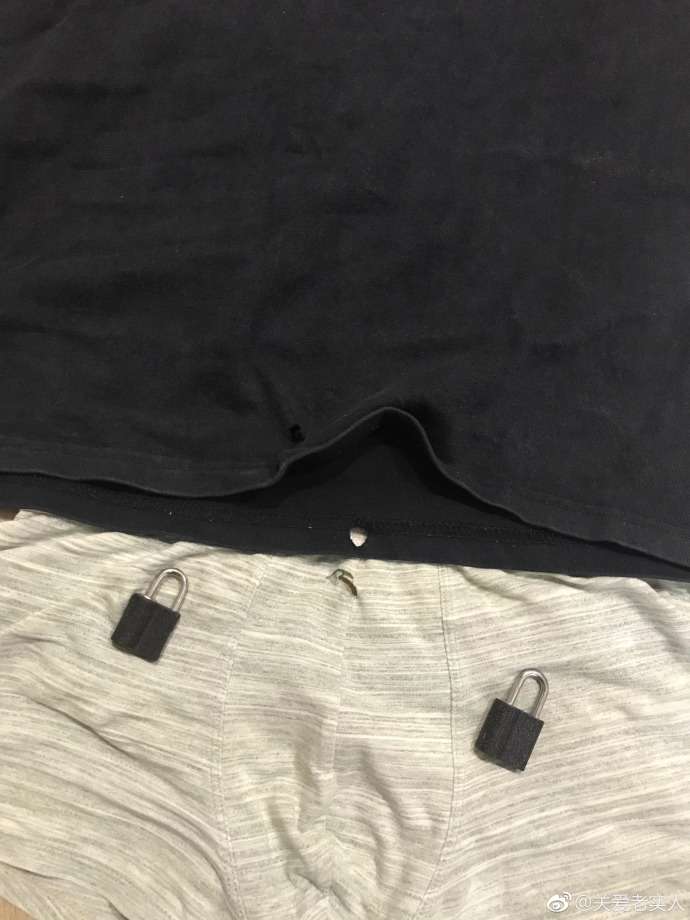 ▼準備洗澡睡覺時,女網友發現男友的內褲、T恤前後上鎖,原來男友的媽媽知道兒子要見網友,非常擔心,害怕他失身,就將他鎖了起來。女網友很崩潰:「我讓他撕開也不撕,害怕回家被他媽媽打,20多歲的人了,還這樣我真服了,我生氣讓他趕緊打車回家,有點無語遇到這樣的奇葩。」