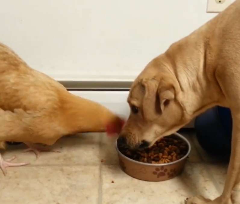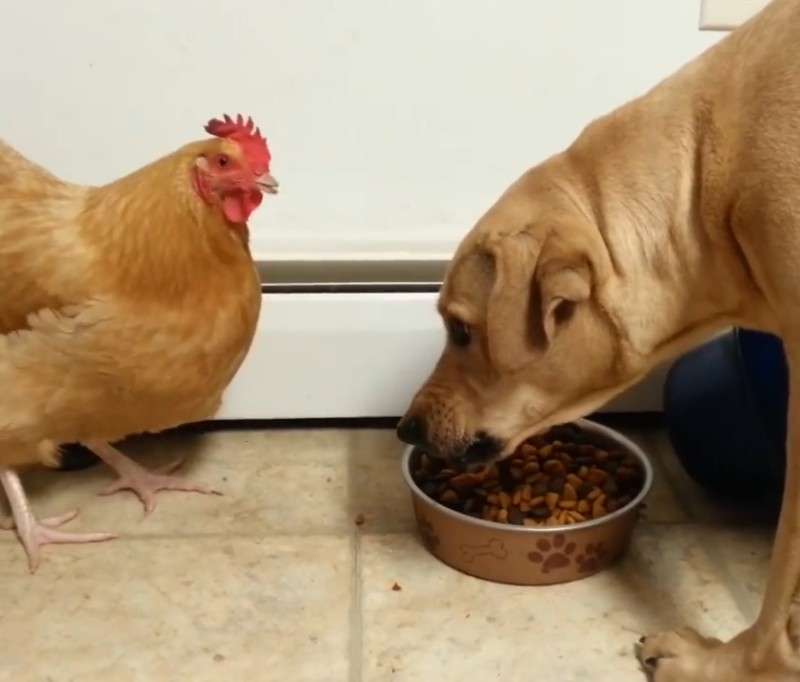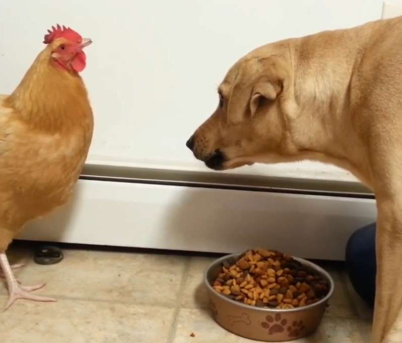 ▼影片一開始,一雞一狗站在狗狗的飼料碗前互相對視。