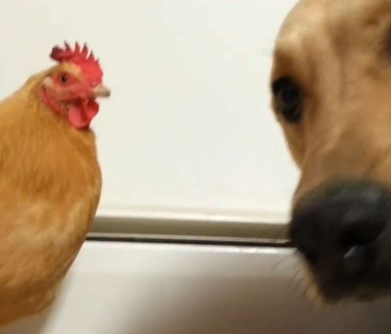 ▼被這隻雞如此冒犯,狗狗也有些不爽了,喉嚨間開始發出低沉的嘶吼,警告對方「不要靠近」。