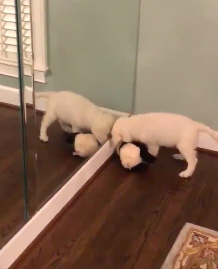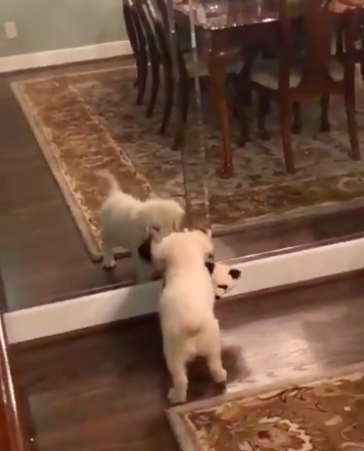 小白汪照鏡子「發現新朋友」 牠開心叼玩具跑過去:我們一起玩~