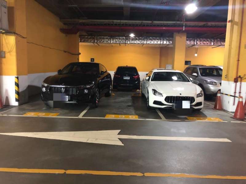 ▼原PO表示,他在商場的地下停車場停車時,無意中看到2輛跑車佔用3個停車格的照片,忍不住拍照PO到網路上公審,並說:「一樣的品味,一樣的水準…」