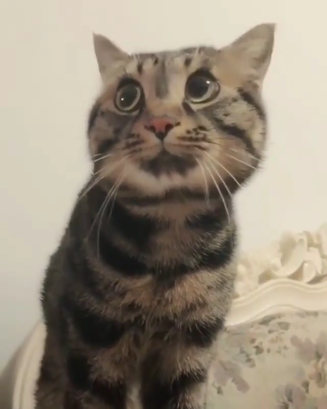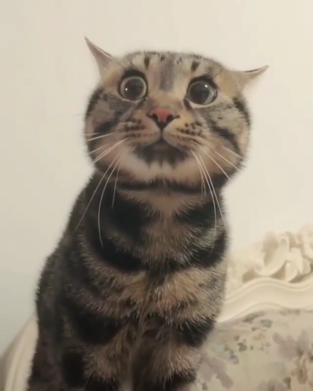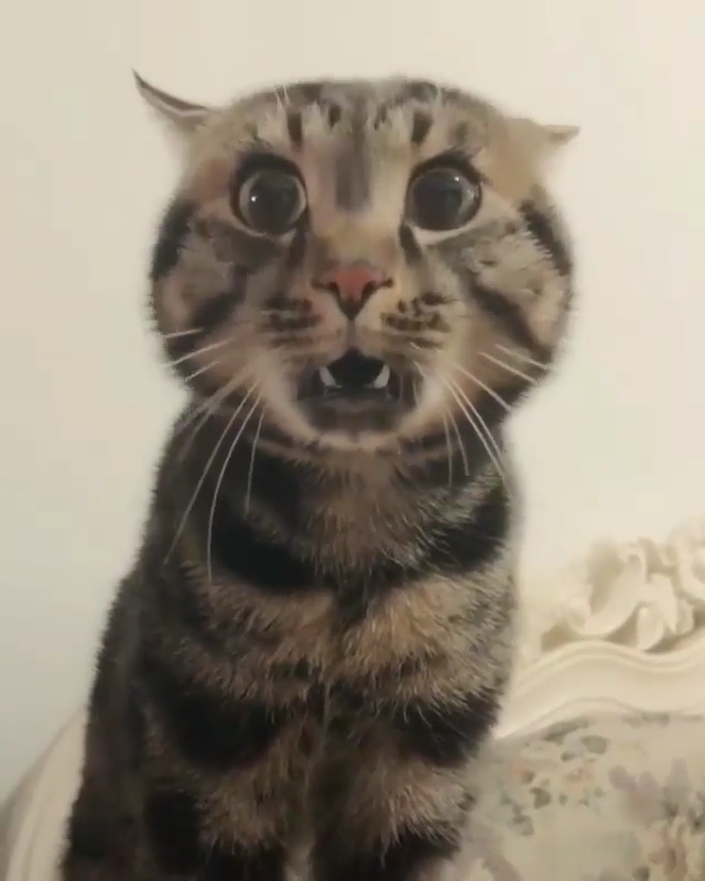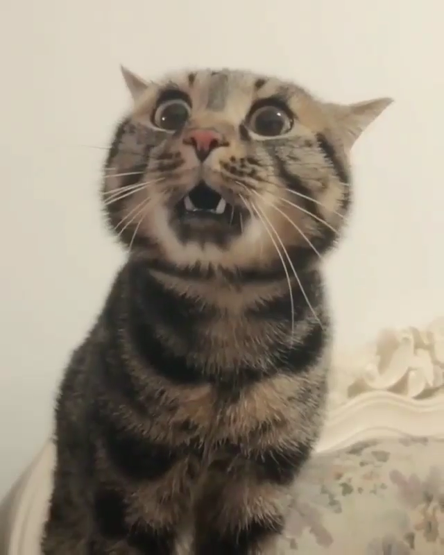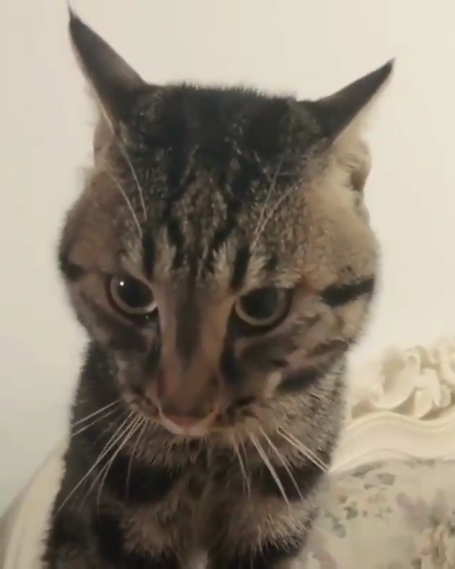 ▼喵皇杏目圓睜,奮力發出「凹嗚~」,用力地連脖子都縮起來了呢。