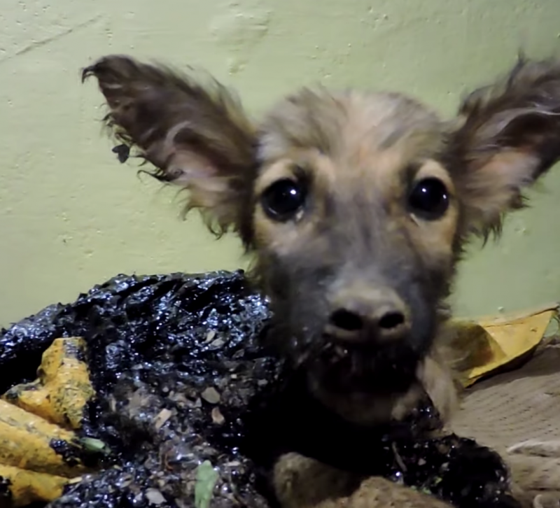 在這隻三個月大的小狗奄奄一息時,動物保護組織趕到並挽救了牠的生命,附近正在鋪路,這隻小狗可能是誤闖了。他們把牠帶回中心,花了好久的時間來把牠身上的瀝青清乾淨。