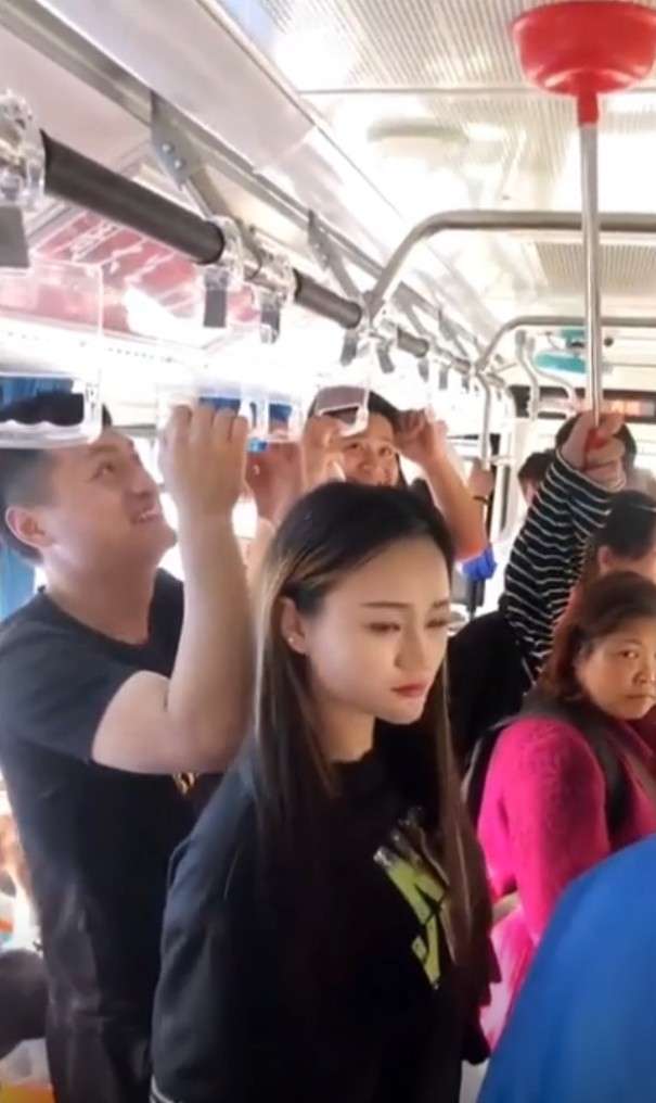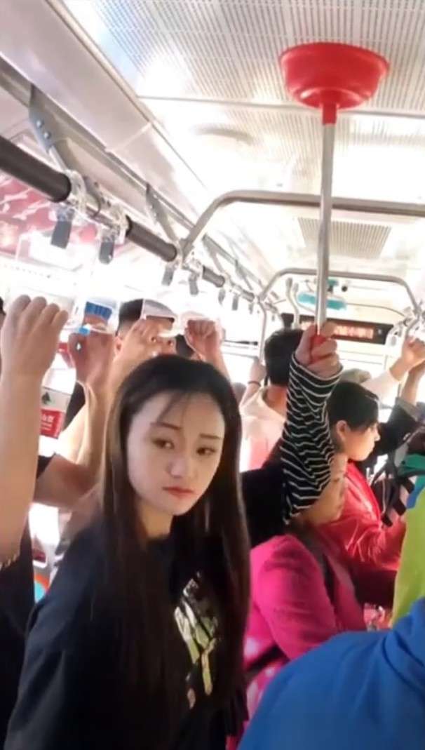 ▼這件事情發生在江蘇省的淮安市,這名女子搭上了一輛載滿人的公車,在確定找不到拉環之後,她將手上的馬桶塞一把黏到了公車的天花板上。