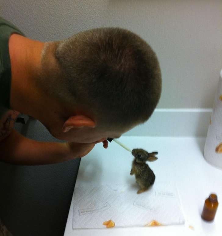 ▼美國海軍在兔子洞中發現了沒有呼吸的兔子媽媽和4隻小兔子。2個月來,他每天用滴管餵食4次,照顧兔子寶寶們成長。