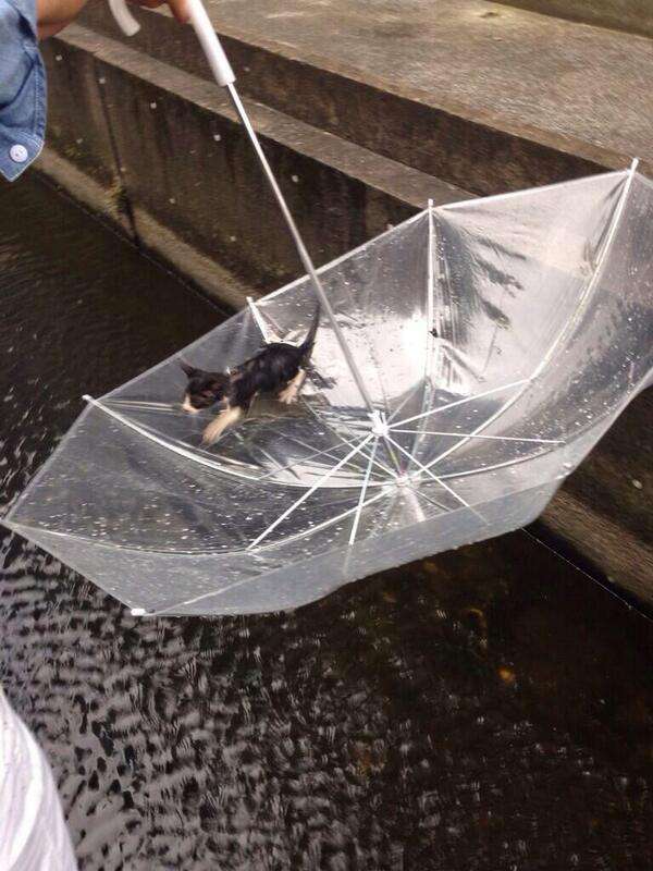▼善良的男子用雨傘救了一隻落水的小貓。