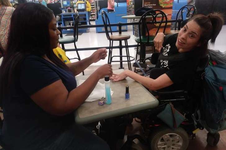 ▼美甲沙龍拒絕為這位腦癱患者服務,因為她無法控制自己的身體動來動去。善良的收銀員在休息時間買了一瓶指甲油,親自幫她美甲。