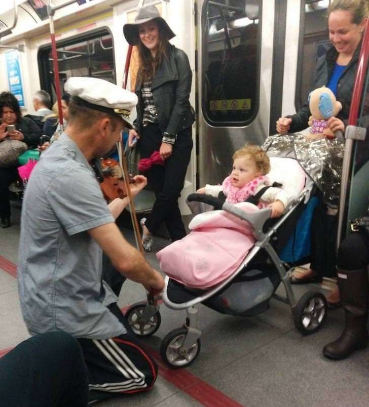 ▼男士為地鐵上哭鬧的小朋友拉起小提琴。