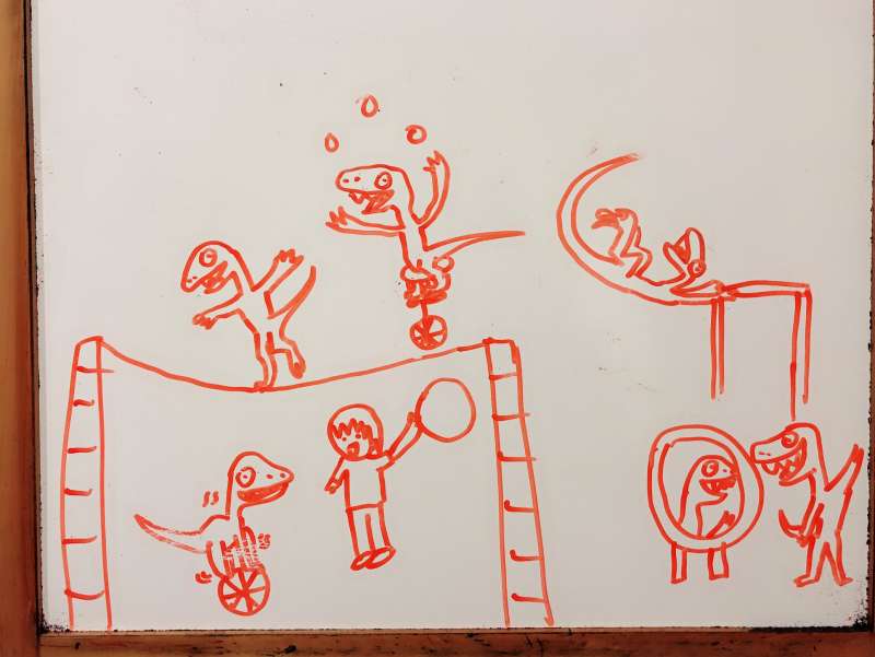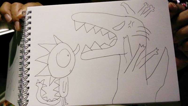 ▼那天起,綺綺就會把畫作中的恐龍當成是自己。施景中記得很多她畫的內容,像是恐龍媽媽正在教訓小恐龍、小恐龍掉頭髮掉牙齒…這些都是綺綺和爸爸媽媽的日常。