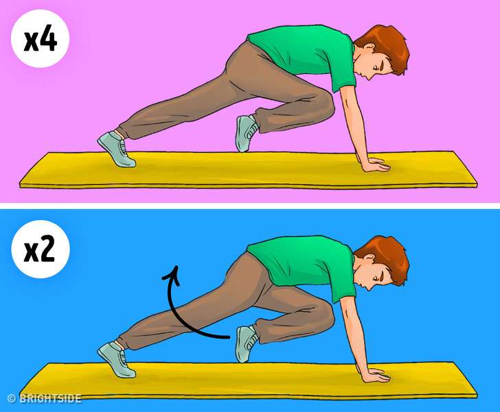 先將自己做好俯臥撐的準備姿勢,背部打直,將膝蓋拉到約腹部的位置,接著換角。完成原地爬山的動作後,將身體轉動,用左手和右腳撐在地上,做出下列那個動作。