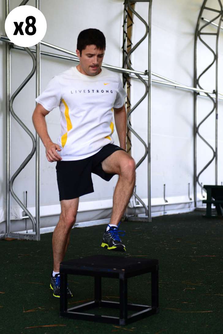與一般登階不同的是,要換腳時踩在小椅子上的腳出力讓身體跳起來,接著在空中換腳。