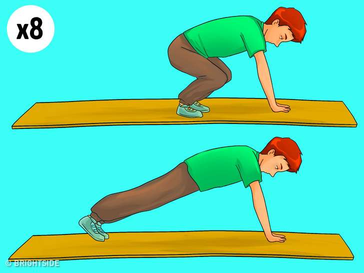 這兩個動作相信大家都不會太陌生吧!進行了5下開合跳後,蹲下將手掌平放到地面,雙腿向後移進入俯臥撐的姿勢,接著收回雙腿向上跳。連續做8次之後,休息一分鐘換動作。