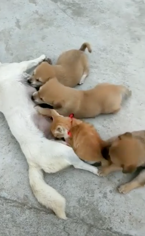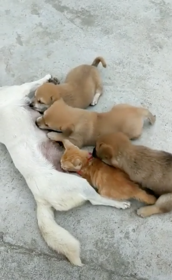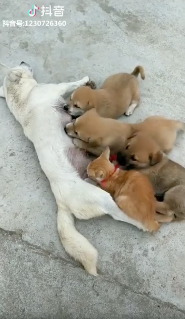 狗媽媽似乎照顧寶寶太累,已經睡到不想醒來,當然也不知道自己的孩子被貓咪欺負了。看那隻小狗超哀怨的樣子,真的是餓到好可憐了啊。看樣子也只能等橘貓吃飽了才輪到牠了。這次的貓狗大戰,狗狗又輸了~