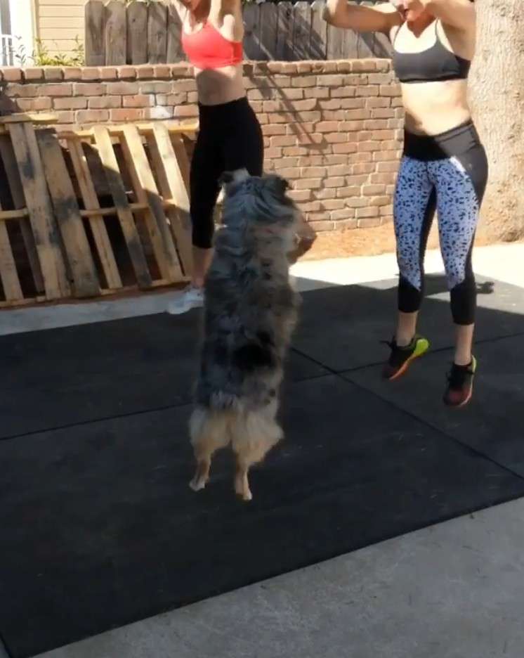 ▼原來當主人與朋友一起進行波比跳(Burpee)時,Tesla也跟著旁邊一起做,不過牠很可愛的將俯臥撐的動作換成了翻滾。