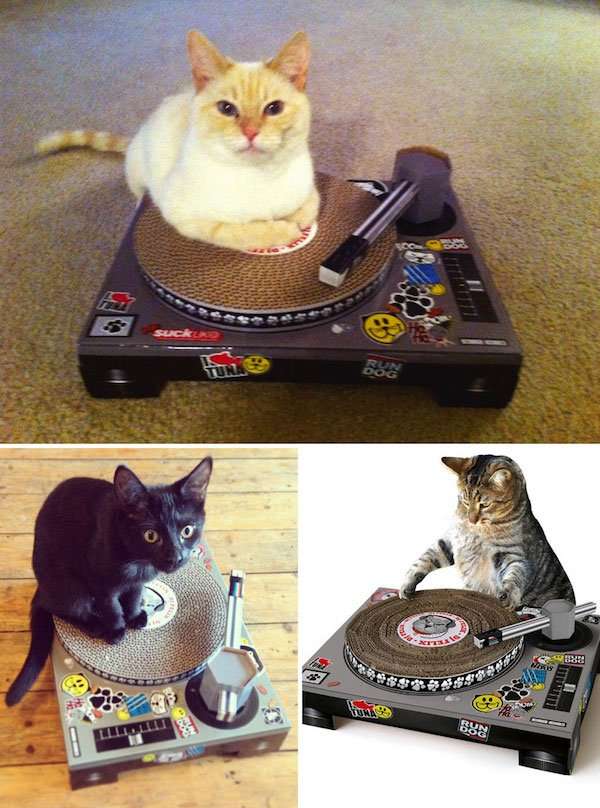 ▼這個DJ貓抓板超好笑,貓咪也走夜店風嗎?
