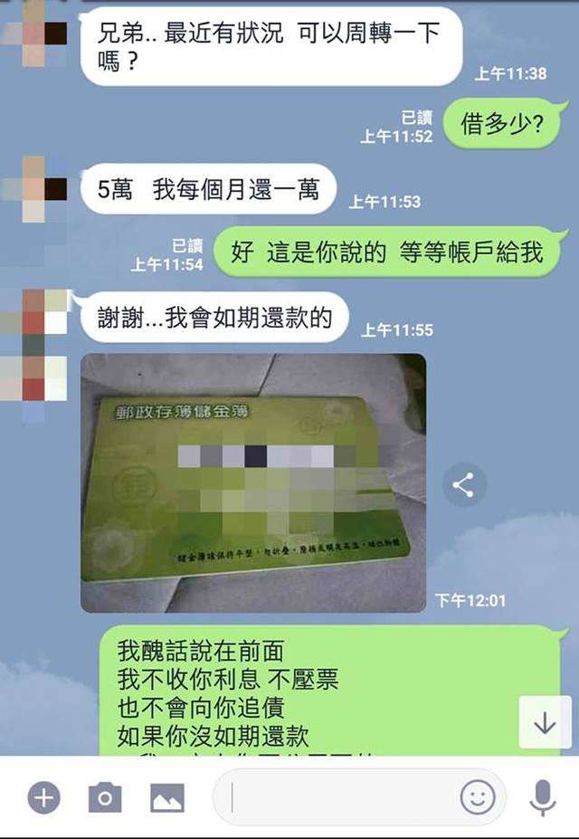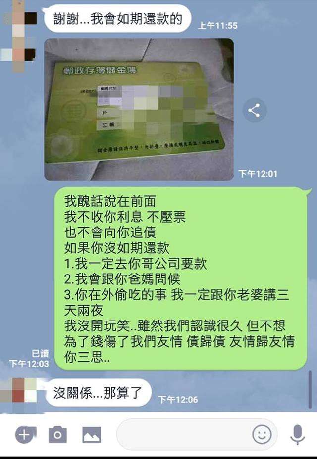 ▼原po提前約法三章,如果對方沒有如期還款,「1.我一定去你哥公司要款、2.我會跟你爸媽問候、3.你在外偷吃的事,我一定跟你老婆講三天兩夜」。他還中肯表示:「我們認識很久,但不想為了錢傷了我們友情…你三思。」沒想到對方看到後立刻說:「沒關係…那算了。」