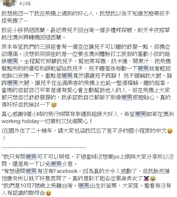 2018年10月10日一個媽媽要帶著孩子搭飛機,所有事情都必須安排好,整個過程靠自己非常不容易。年輕李姓媽媽就是其中一位,她回台灣探親的日子結束後,一個人帶著孩子搭乘華航飛往澳洲,沒想到在飛機上會遇到暖男主動照顧孩子!整個超難忘的經歷讓她決定PO到網路上,除了感謝他,也希望大家看到社會還是有溫暖的人!