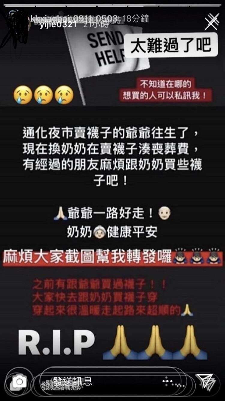 ▼如今攤車的老爺爺已經換成了老奶奶,網友一問之下才知道原來老爺爺已經走了。老奶奶只是負責把庫存賣掉,她也透過好心網友幫忙告知大家她並沒有湊喪葬費,網路上的募款帳號都是騙人的。網友們只要幫忙她買襪子就好了。