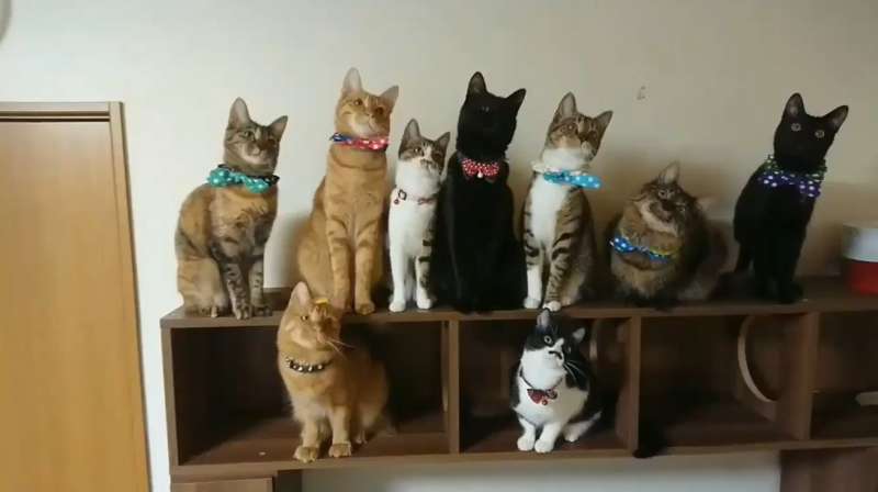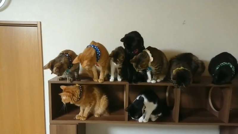 ▼影片中可以看到9隻毛色各異的貓咪一起待在櫃子上,頭部完全「神同步」的望向同一個方向。