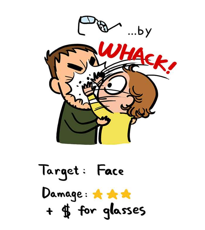 ▼攻擊目標:臉部。『傷害程度』- 三顆星+買副新眼鏡的錢。牛寶:「啊噠~(使出如來牛掌一個重擊)!」、牛爸:「……寶。(終於把話說完了,但眼鏡也跟著壯烈犧牲了)」