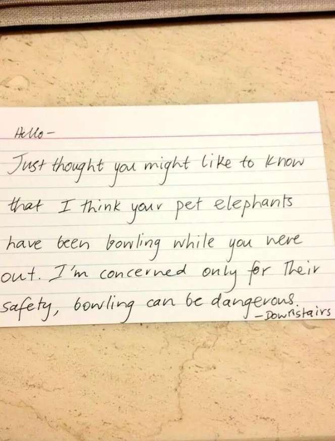 ▼也曾經嘗試留言給他們:「你好,你可能會想要知道,你家中飼養的大象總是趁你不在家時瘋玩保齡球,我非常擔心牠們的安全,保齡球有可能會帶來危險的! -- 你樓下的鄰居」…