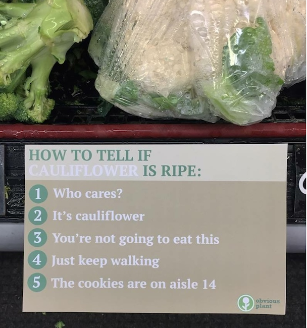 ▼超市裡「如何知道白花椰菜壞了沒」的標示:1. 誰管你? 2. 這就是個白花椰菜。 3. 你就不會吃它。 4. 繼續逛超市吧。 5. 餅乾在第14區。