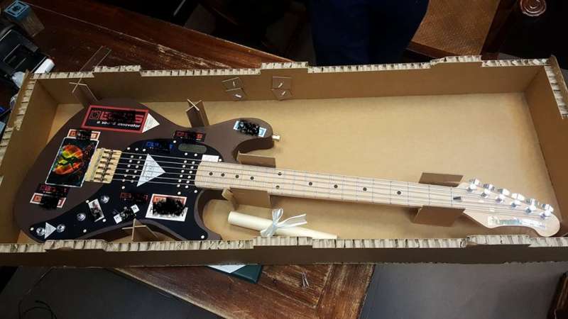 ▼也有人曾經要求打造一個親友生前最愛的吉他,款式和上面的貼紙都必須完美複製,由於真品價格太高不可以燒,因此選擇製作一個一模一樣的紙紮品。