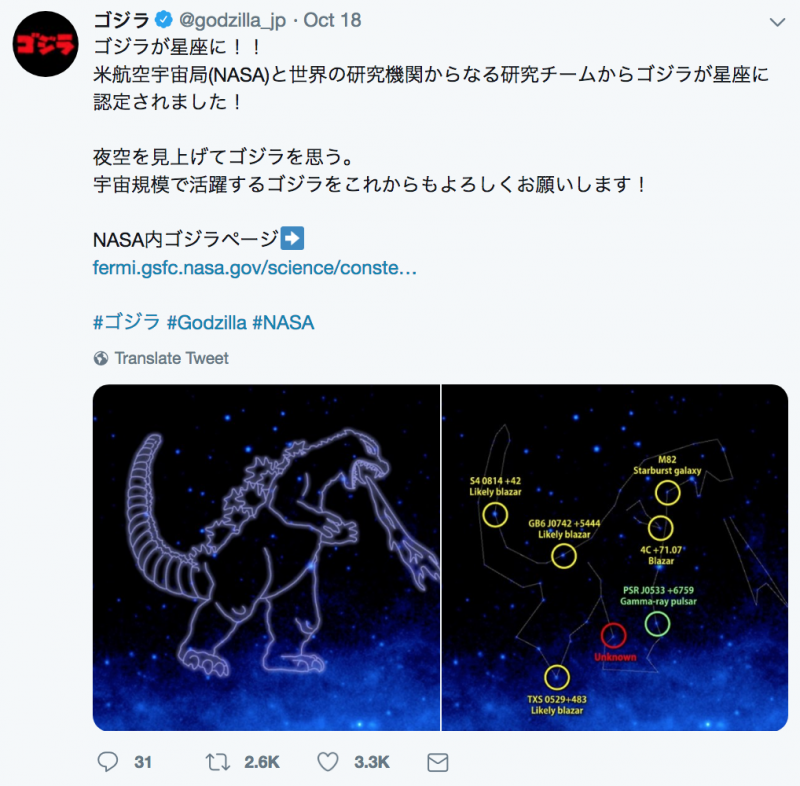 2018年10月20日NASA官方認證!美國國家航空暨太空總署(NASA)靠人造衛星「費米伽瑪射線空間望遠鏡」觀測到新的星座。這次發現的其中一個新星座由發散「伽瑪射線爆」(Gamma Ray Burst,縮寫 GRB)的星體所連成,他們仔細一看發現怎麼跟哥吉拉(ゴジラ)那麼像?