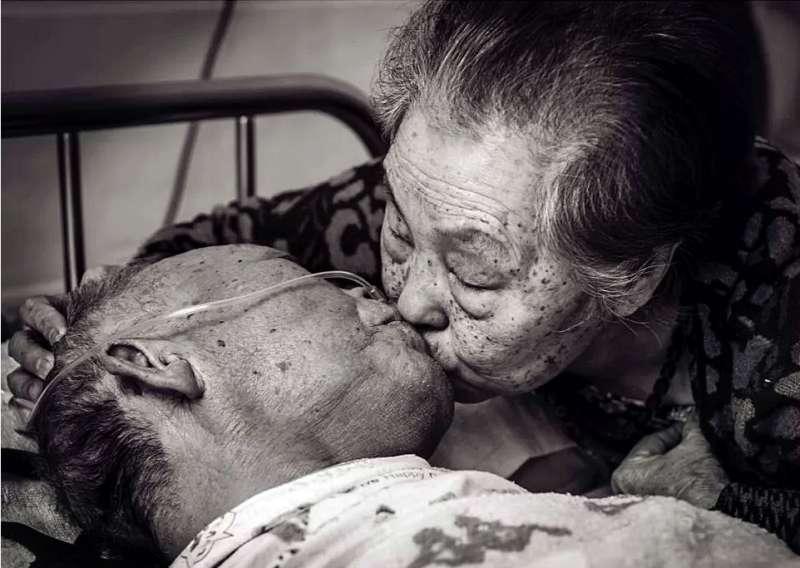 ▼看到妻子後,他用盡全力說:「這一次,恐怕是來真的了。」接著,父親顫抖地說:「親親,親親…」妻子淚流滿面,聽到老伴的要求後,立刻彎腰送上一吻。徐英喆將這一幕拍攝下來,這張照片也獲得了香港影展金獎。