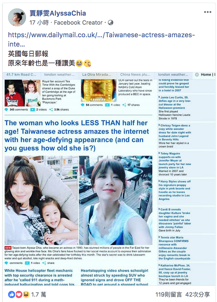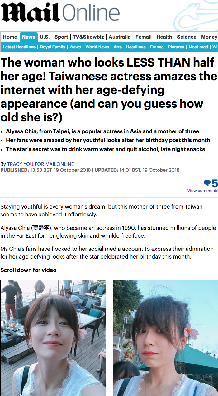 2018年10月20日已經是3個小孩的媽媽,賈靜雯卻被英國媒體認為只有22歲?英國《每日郵報》被她的凍齡美貌震撼,特別寫了一片報導,還放上標題「看起來比實際年齡年輕一半的女人!台灣女星的逆齡樣貌驚艷網友」。本尊過後也在臉書PO出截圖,笑著感謝媒體的報導。