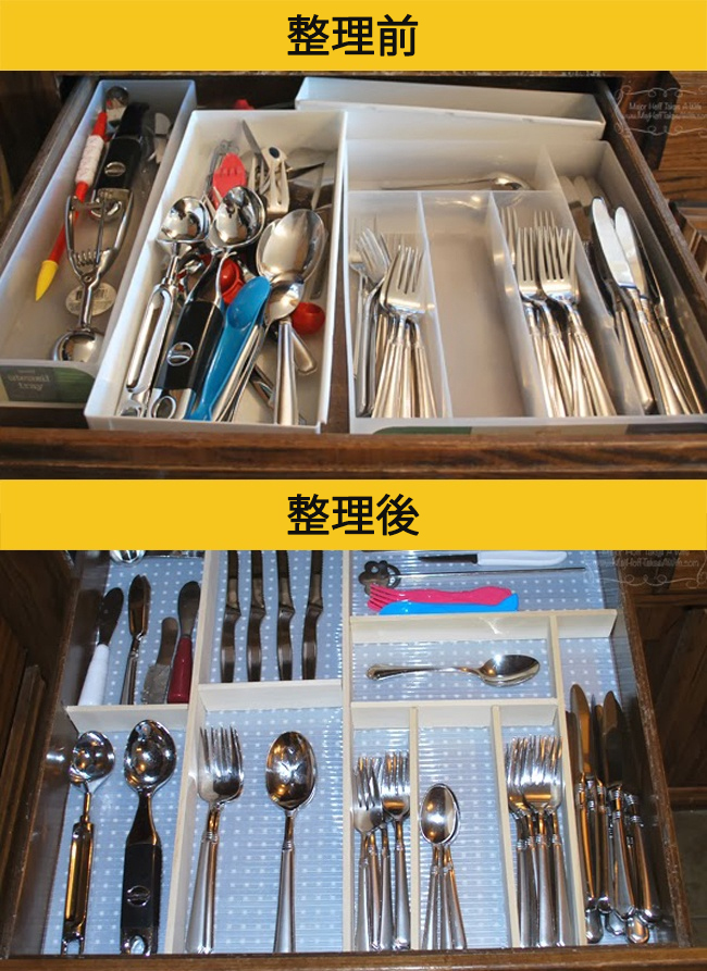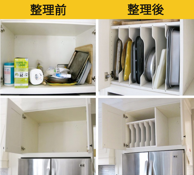 ▼10. 扁扁的會東倒西歪的廚具,將收納格變成左右的方式收納,就可以收納更多的物品了。