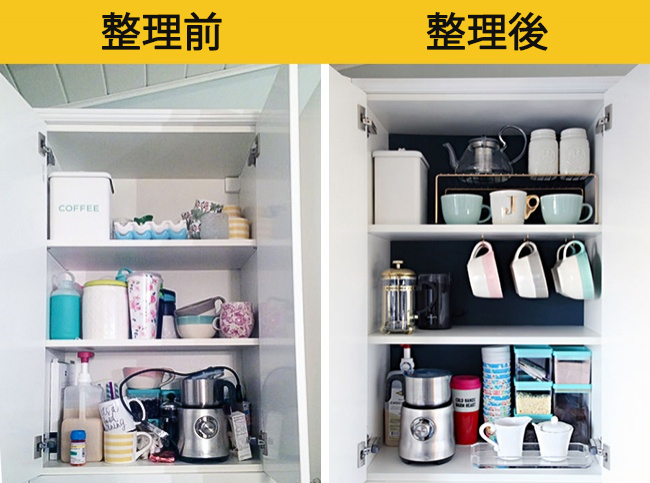 ▼1. 善用櫥櫃高低差,增加隔間或者掛勾來擴大收納空間。