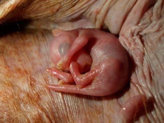▼袋鼠寶寶在育兒袋裡沒有皮膚。