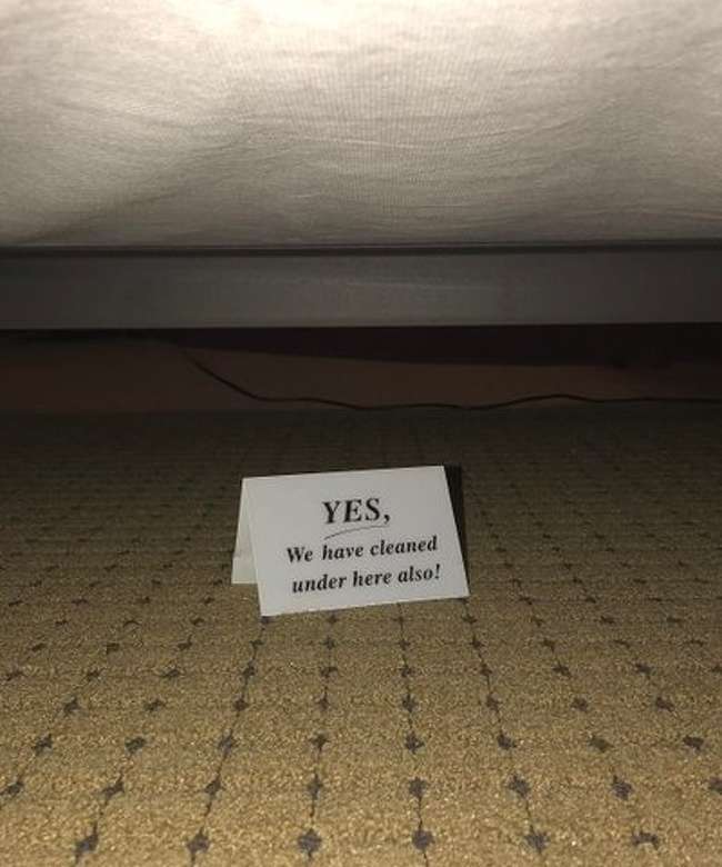 ▼在你檢查床底時,下面還附了一張卡片,上面寫道「是的,我們連床底也清理了!」