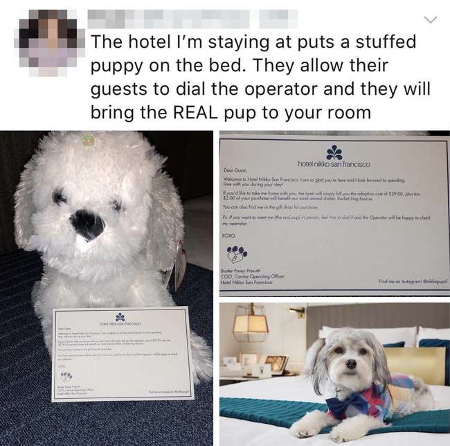 ▼這家飯店在床上放了一個狗狗的填充玩具,如果你想要真的狗狗也可以通知櫃檯送一隻狗狗上來!
