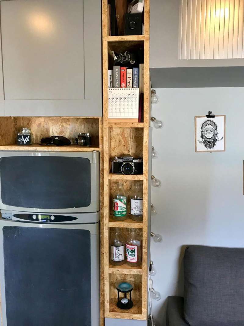 ▼廚房內有烤箱、爐灶、冰箱等設施,他們還設計了很多置物架,可以放置零散的小物。客廳中有沙發,臥室中有床、衣櫃。