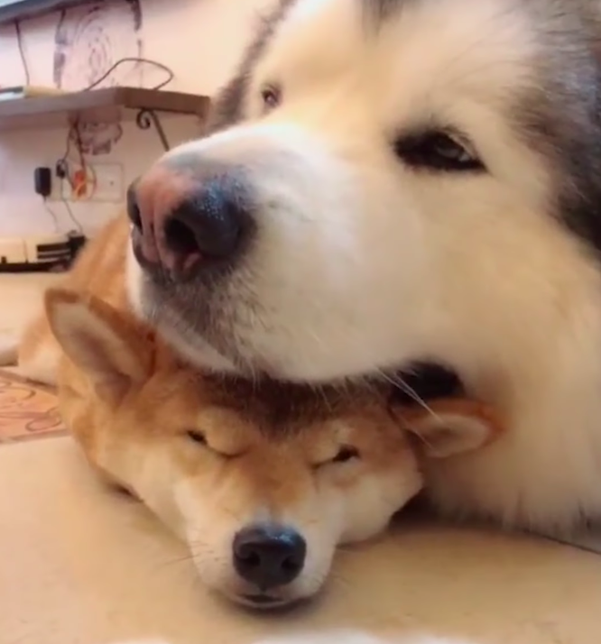網友們看到後紛紛表示:「小心等一下被咬XD」、「應該是你要給柴柴靠吧」、「柴柴:很重欸你這大摳呆」。阿拉竟然枕著柴柴睡著了,這兩隻狗狗的友誼真的很深厚啊~
