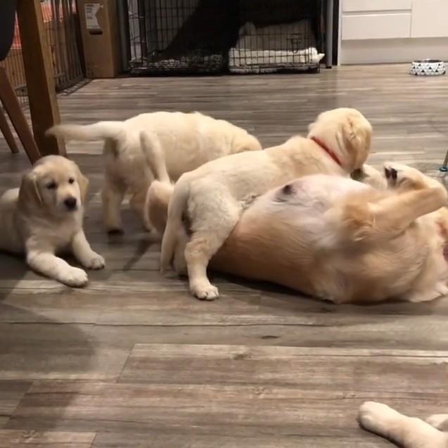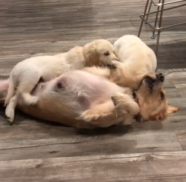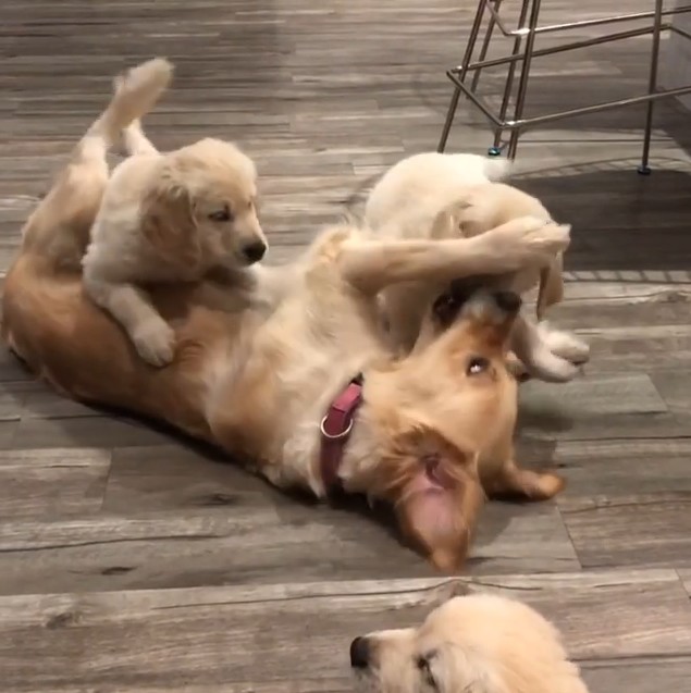 母親的偉大在於她們對小孩們無私的付出,全年無休的為小孩提供愛護和照顧,忙得連休息時間也沒有,這個工作可說是所有職業中最辛苦的一個!當小孩特別好動時,不僅是人類,就連狗媽媽也會被盧得無可奈何,就好像以下這隻金金媽一樣…