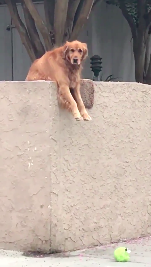 ▼網友Johnny Berchtold住在Riley家附近,那天他在推特po出一段影片,並說:「牆上狗狗的球掉了,不過不用擔心,我撿起來還給了牠,還和牠玩了一下。」