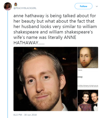 2018年10月27日《時空旅人》講述一對情侶穿梭過百年時光依然找到對方的電影,沒想到現實也有同樣的劇情上演?!而主角就是有名的安海瑟薇和她的老公Adam Shulman,網友看了他和莎士比亞的肖像對比圖,忍不住驚呼:「根本是同一個人吧?!」