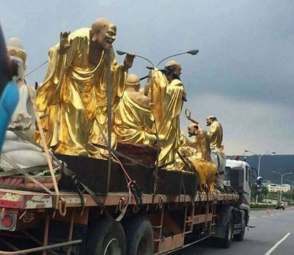 ▼這已經不是佛祖第一次展現自己的時尚感啦。下面這台貨車載著羅漢在路上行駛,路燈成為了背景,羅漢們好像拿著麥克風盡情嗨唱,瞬間變身超級天團。