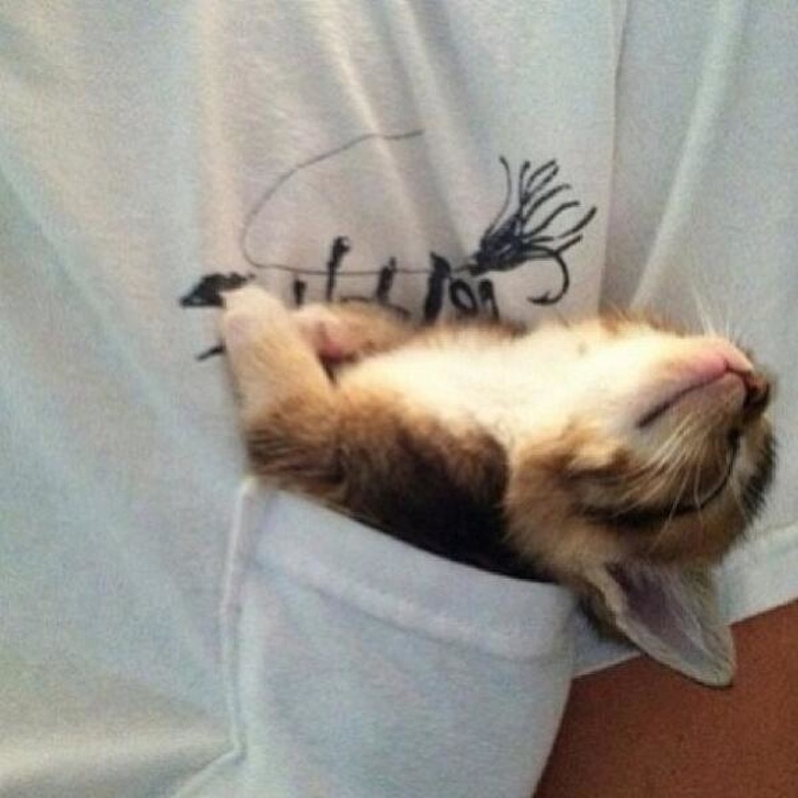 ▼「這是奧黛莉(Audrey),她是我有史以來所見過最小的貓咪,而且她就這樣在我室友胸前的口袋裡睡著了。」