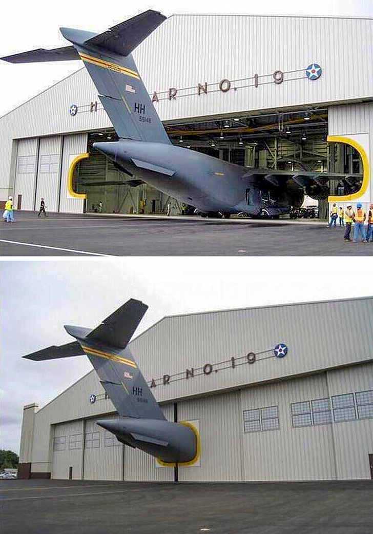 ▼飛機無法完全停進室內?在門上動點手腳就行了!